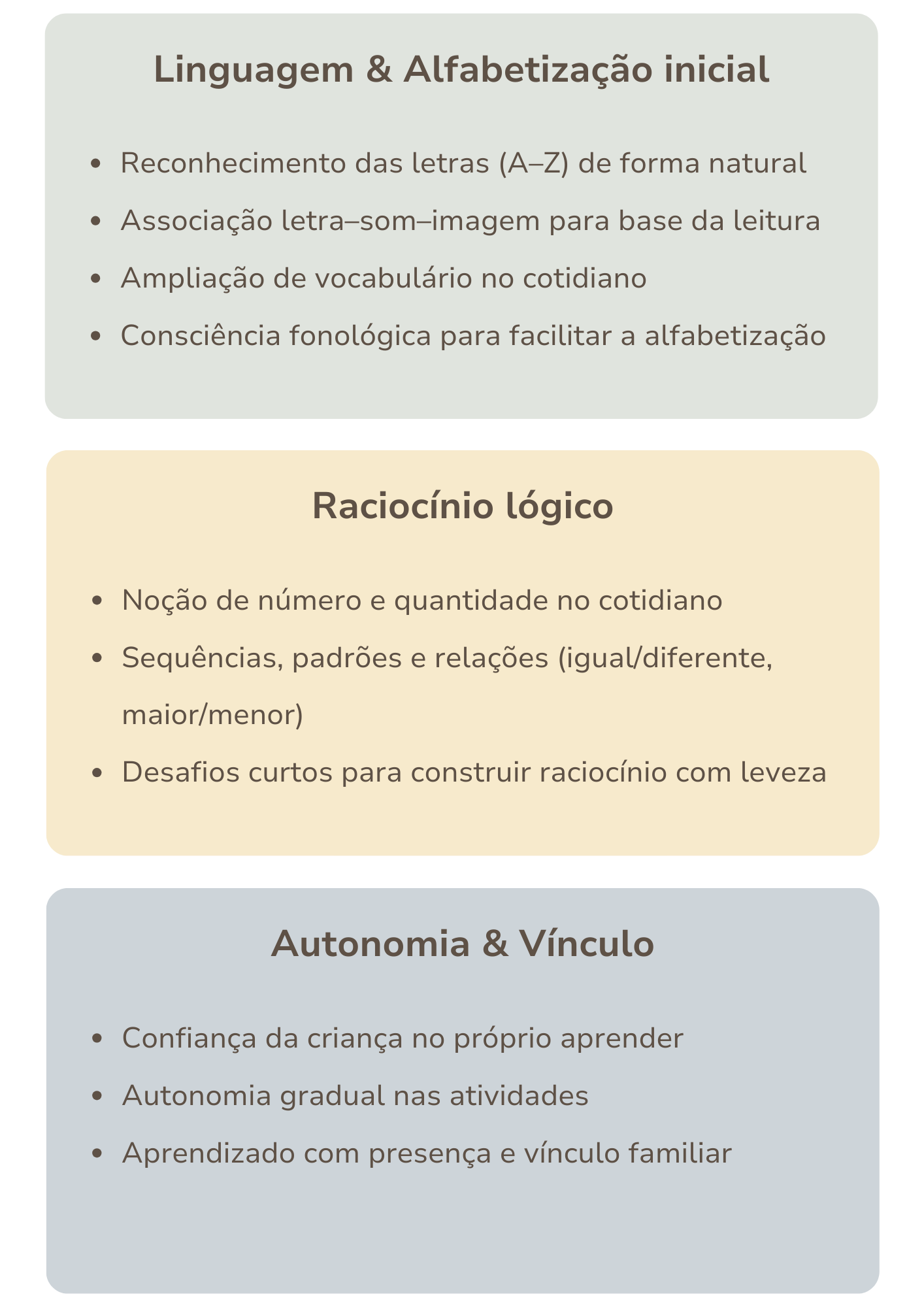 Atividades que estimulam linguagem, coordenação motora fina, raciocínio lógico, percepção visual, criatividade e habilidades matemáticas iniciais, respeitando o ritmo natural da criança e promovendo aprendizado com presença, afeto e experiências reais, longe das telas.